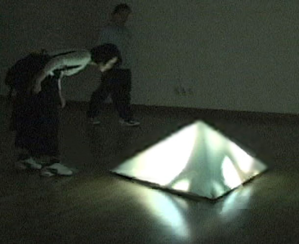 Video Projection mapping ( 140 cm* 140 cm * 140 cm), Structure tetrahedron( h: 50cm, d:70cm, l: 140cm ) © unzi 1998